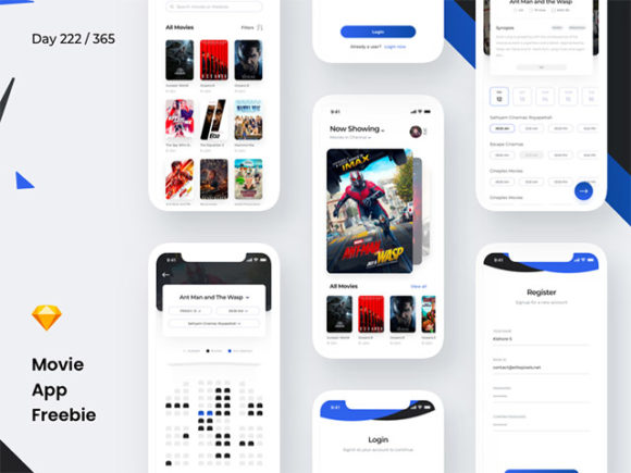 Kit includes an home screen, a movie info screen, booking and seat confirmation screens and sign in, sign up pages. Designed and released by Me